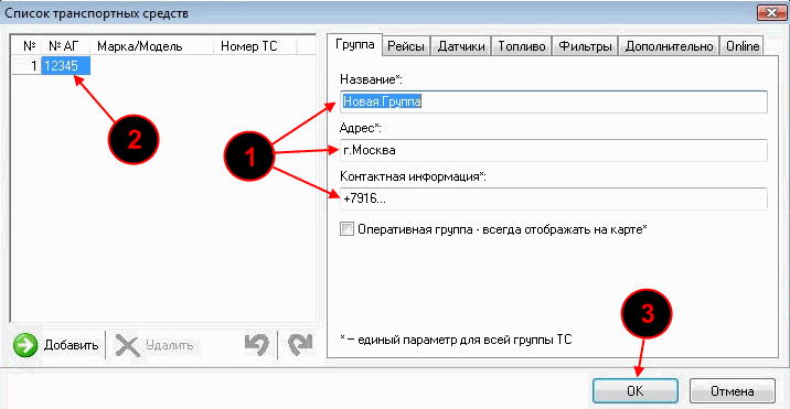 | 2. | добавляем в группу транспортные средства и настраиваем их параметры (параметры рейсов, датчиков, расхода топлива...); |