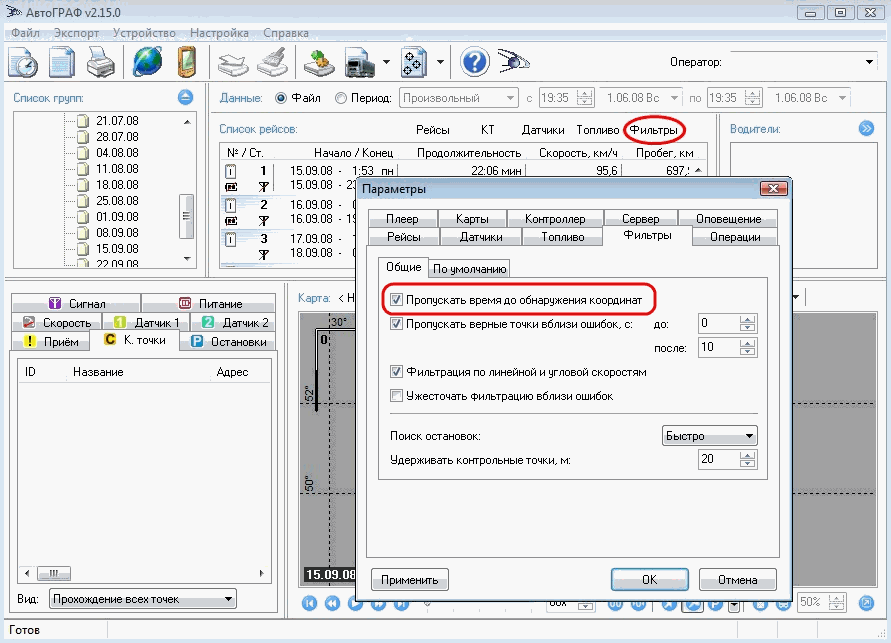 Ответ: Включите в фильтрах галочку "Пропускать время до обнаружения координат"