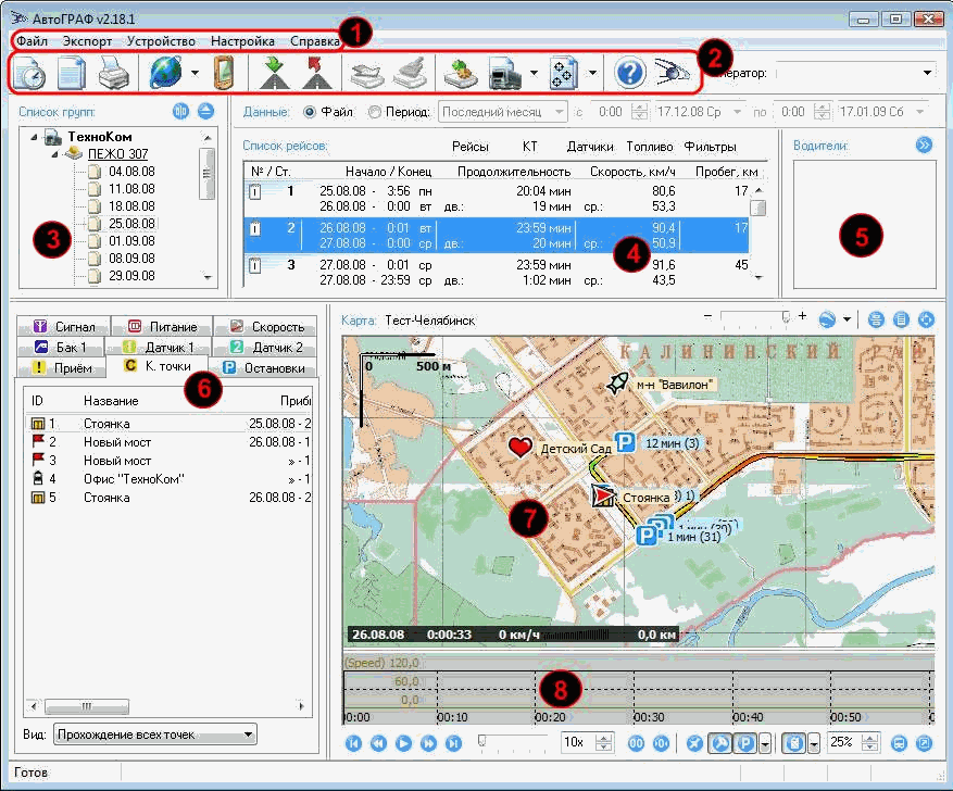 | 4. | отображение списка рейсов (если в списке групп (3) выделено устройство) или информации об устройстве (если в списке групп (3) выделен период рейса); |