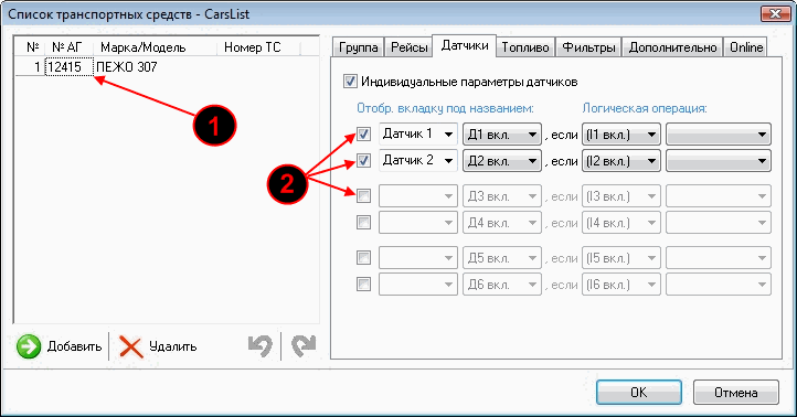 А также любые другие параметры, указанные клиентом при установке системы на автомобиль. Параметры датчиков настраиваются в "Списке транспортных средств"