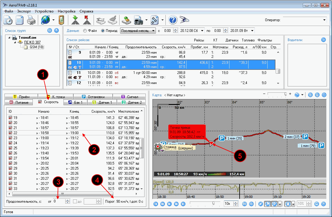 | 5. | информация о превышении скорости на карте местности. Указаны: скорость движения автомобиля, дата и время превышения скорости. |