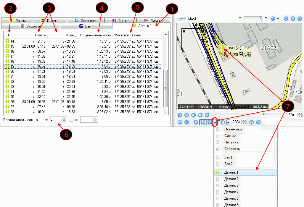Для просмотра точки выключения сигнала нужно в списке срабатываний датчика нажать на записи правой кнопкой мыши и выбрать "Показать на карте выключение". |
