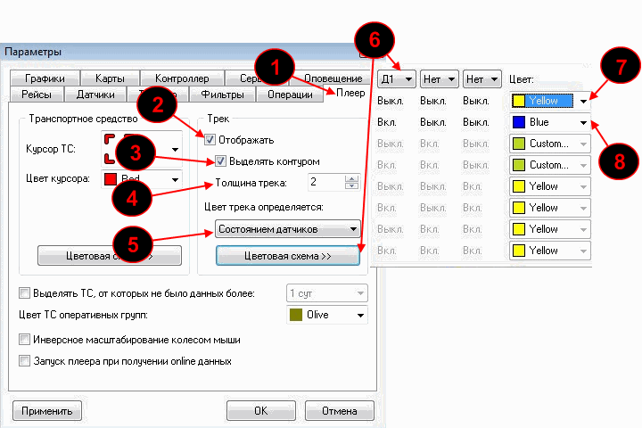 Для удобства просмотра на карте включения и выключения сигнала можно настроить отображение трека цветом для включенного и выключенного сигнала: для этого заходим в настройки нажатием на кнопку "Параметры"
