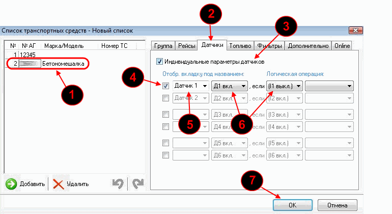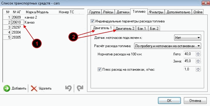 При наличии на автомобиле двух двигателей все их параметры устанавливаются и контролируются раздельно. При этом не обязательно, чтобы второй двигатель был двигателем внутреннего сгорания. Это может быть рефрижераторная установка или масляный насос "миксера", которые питаются от основного двигателя, но при их работе возрастает расход топлива последнего. Программа будет контролировать расход топлива и считать моточасы раздельно, для каждого из двух двигателей, исходя из их реальной работы.