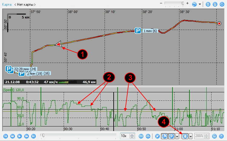 Для контроля температуры в изотермическом кузове автомобиля применяется температурный датчик (опция). В программе значения температуры отображаются в виде графика. В этом же окне отображается график скорости движения автомобиля. Также, могут отображаться графики значений давления масла и температуры двигателя. Просматривать значения температуры как и любые другие параметры, можно за любой выбранный период времени. Окно отображения графиков располагается внизу окна карты.