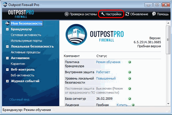 Запустите Outpost Firewall. В меню выберите "Настройки".