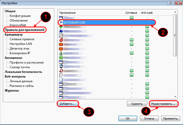 Выберите пункт "Правила для приложений" (1). Если в списке нету файла "AutoGRAPH.exe" (2), то нажимаем кнопку добавить (3), находим и выбираем файл "AutoGraph.exe" (обычно находится в C:\Program Files\АвтоГРАФ\AutoGRAPH.exe), после этого он добавится в список (2). Если файл уже есть, то выделяем его и нажимаем кнопку "Редактировать" (4).