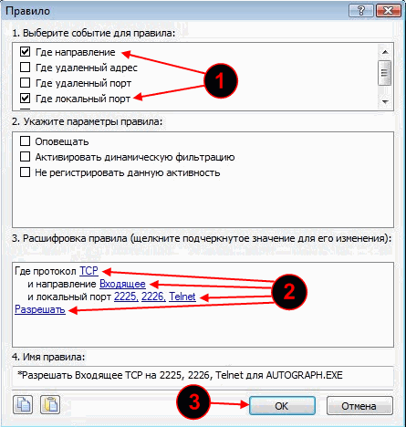 В окне "События" ставим галочки "Где направление" и "Где локальный порт". В пункте 3 (Расшифровка правила) для изменения значений нажимаем на синий подчеркнутый текст. Выбираем "Где протокол TCP" и "Направление Входящее" и "Локальный порт 2225, 2226, 23" "Разрешать" (2) (вместо порта 23 будет написано Telnet). Нажимаем на "ОК" (3).