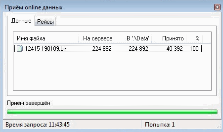 Процесс приёма отображается в отбельном окне "Приём online данных", вызываемом через меню -> Настройка -> Окно приёма online данных или нажатием сочетания клавиш "Ctrl+Z". После получения данные сохраняются п папку "Data" программы "АвтоГРАФ" под именем nnnnn-ddmmyy.bin, где: nnnnn - серийный номер устройства; ddmmyy - дата сохранения (dd - день, mm - месяц, yy - две последние цивры года). Серверная программа делит поступающие online данные каждого устройства по неделям, начиная новы файл каждый понедельник в 0:00:00, поэтому день недели даты сохранения - всегда понедельник.