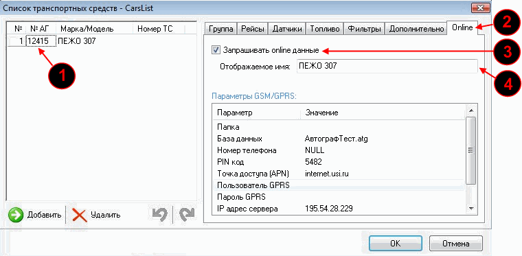 Для автоматического получения Online-данных нужно в "Списке транспортных средств" выделить в списке нужное устройство, открыть вкладку "Online" и поставить галочку "Запрашивать online данные" и ввести отображаемое имя. Теперь после открытия программы "АвтоГРАФ", при наличии связи с интернетом, сразу будут приниматься online-данные устройства.
