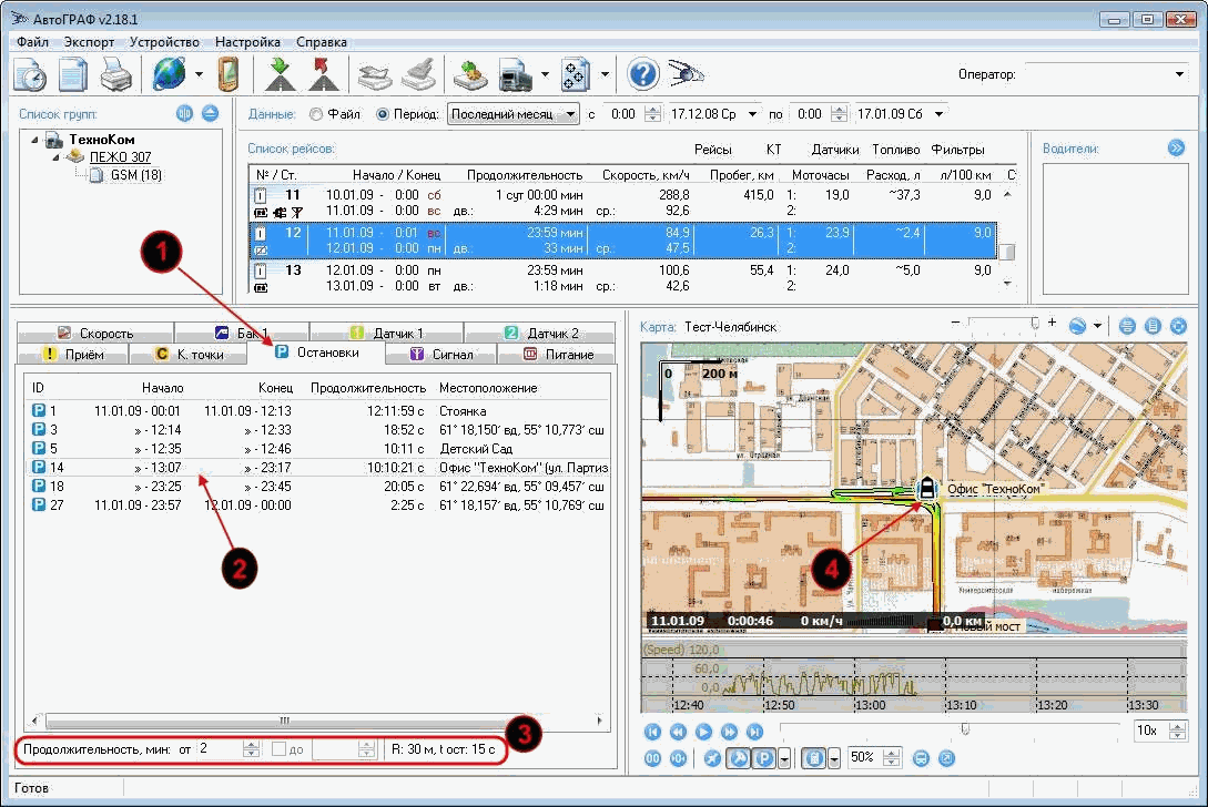 Иногда полезно знать, где и сколько времени находился Ваш автомобиль. Для Вас теперь не будет "белых пятен" в работе Вашего автотранспорта. Просматривать стоянки и остановки автомобиля можно за любой период времени. Все остановки автомобиля отображаются на вкладке "Остановки" (1); В таблице указано: