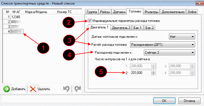 В машине установлен датчик расхода топлива (ДРТ), который предназначен для измерения расхода топлива в топливной магистрали транспортных средств и агрегатов. Датчики настраиваются в "Списке транспортных средств" (