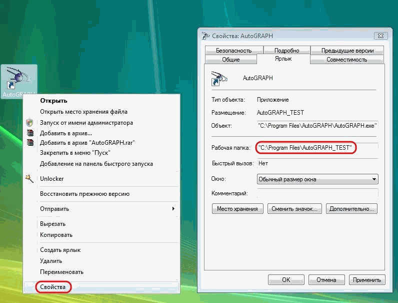 Откройте директорию с установленной программой "АвтоГРАФ" Для того чтобы узнать, в какой директории установлена программа, наведите курсор мышки на значок программы, который располагается на рабочем столе компьютера, кликните на нем правой кнопкой мыши и в открывшемся списке выберите "свойства"; В появившемся окне будет указан путь к папке, в которой находится установленная программа. Чтобы сразу открыть эту папку можно нажать на кнопку "место хранения" (Windows Vista) или "Найти объект" (Windows XP);