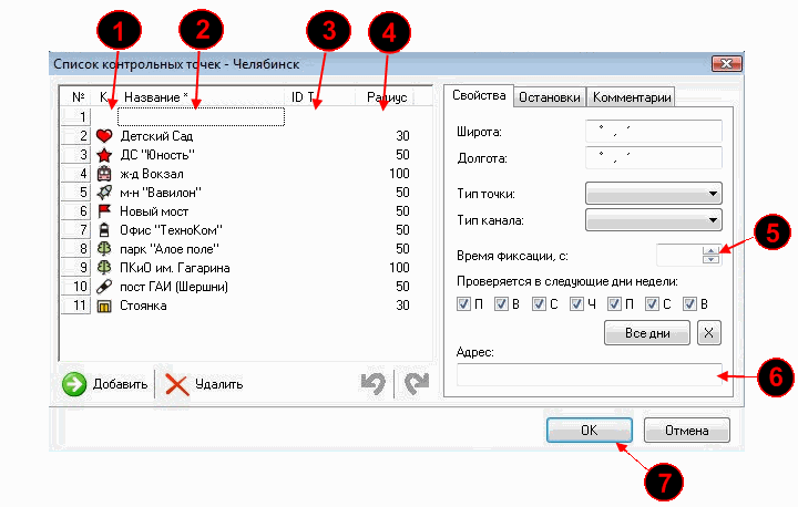 В данном списке мы видим остановки автомобиля, которые имеют названия, и остановки, которые обозначены только географическими координатами. Соответственно, остановки с названиями – это уже имеющиеся контрольные точки.