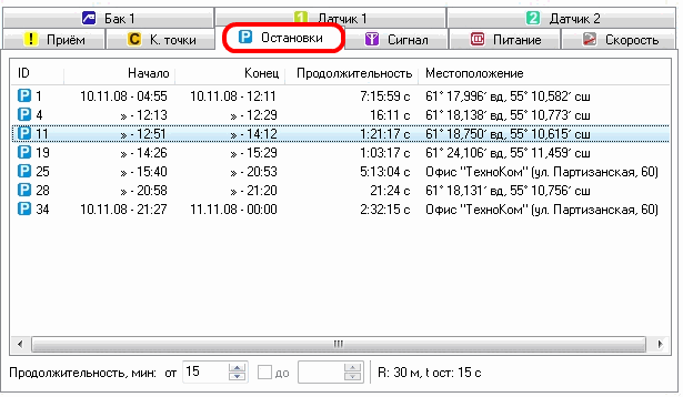 Обычно контрольные точки создаются в местах, где ТС периодически останавливается. Соответственно во вкладке "Остановки" мы видим все остановки ТС.