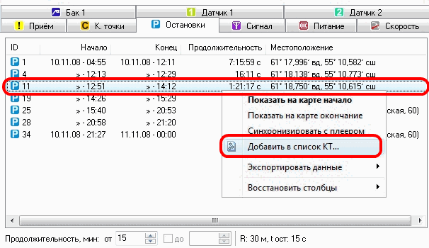 Для добавлении стоянки в список контрольных точек нужно нажать на записи правой кнопкой мыши и выбрать "Добавить в список КТ":